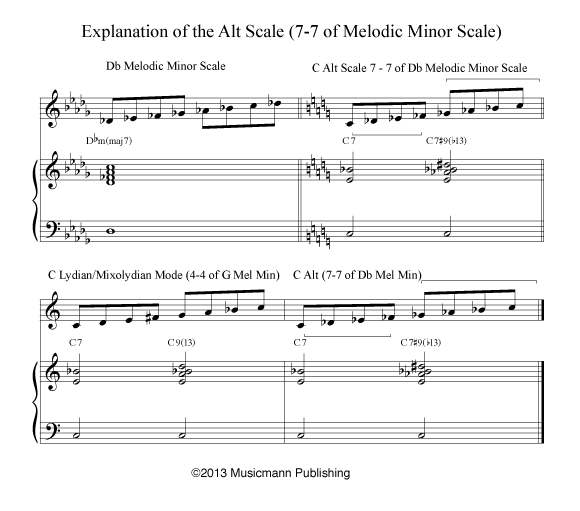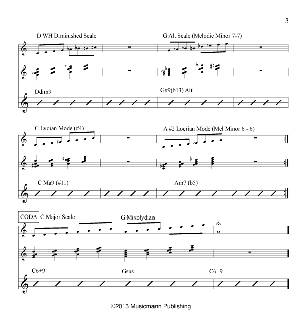 Some of these alterations will be more useful to you than others. The reason that you are practicing them is to place new sounds into your ears. I believe, that once the subconscious assimilates new harmonic vocabulary – then, your natural intelligence will start expressing these sounds in your improvisations and compositions. The most important element is to play them in all keys. Of course, you will be more drawn to certain sounds over others, however, why not play them all? Experiment!