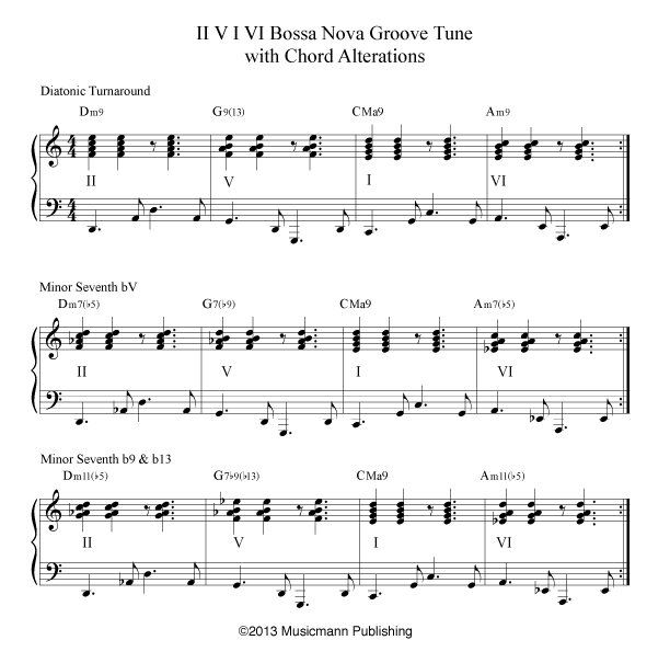 Once you have practiced the V7 dominant chords, start experimenting with alterations of the II, VI and I chords.
