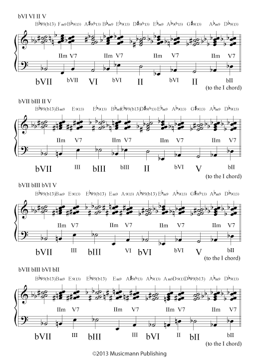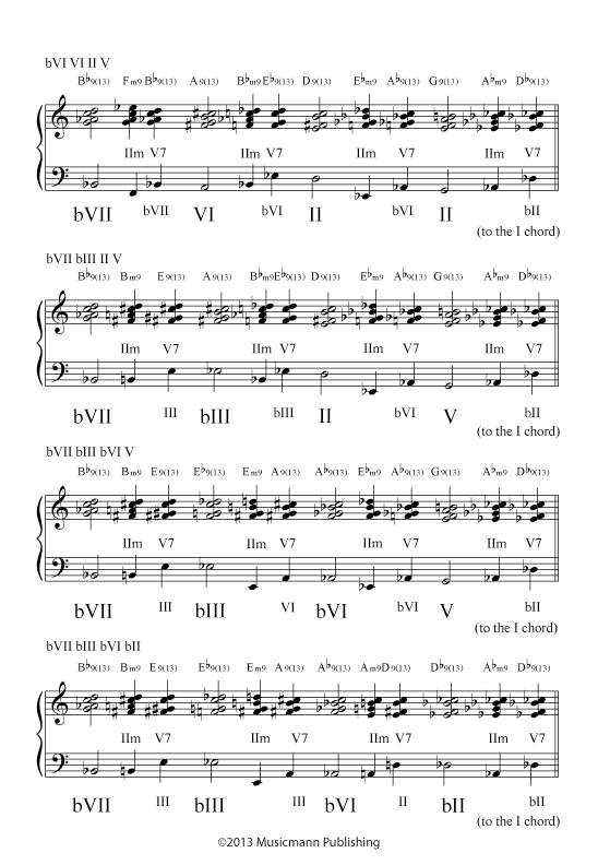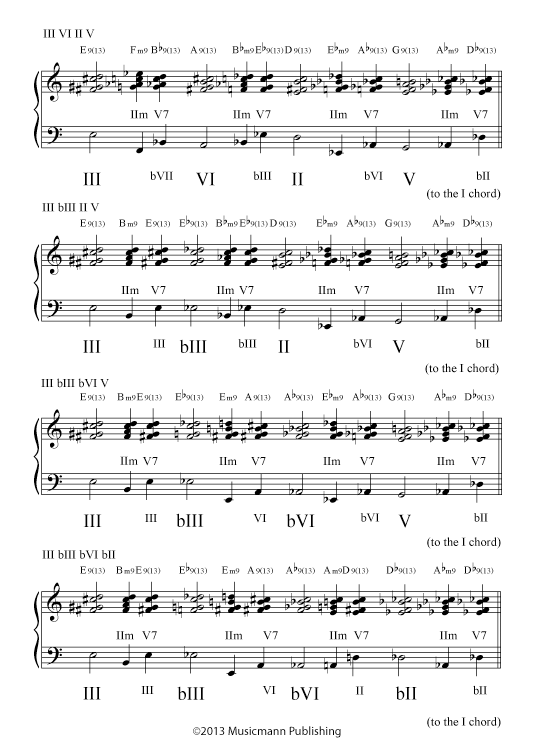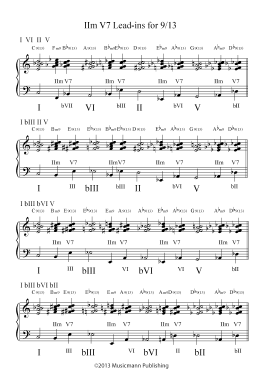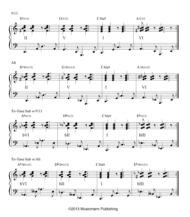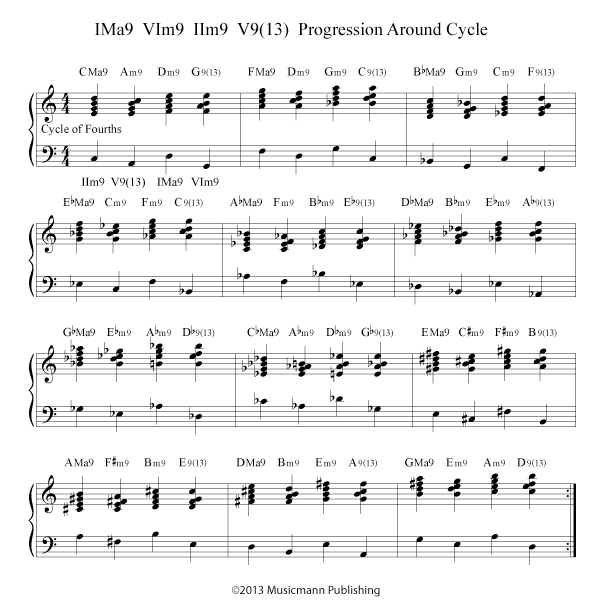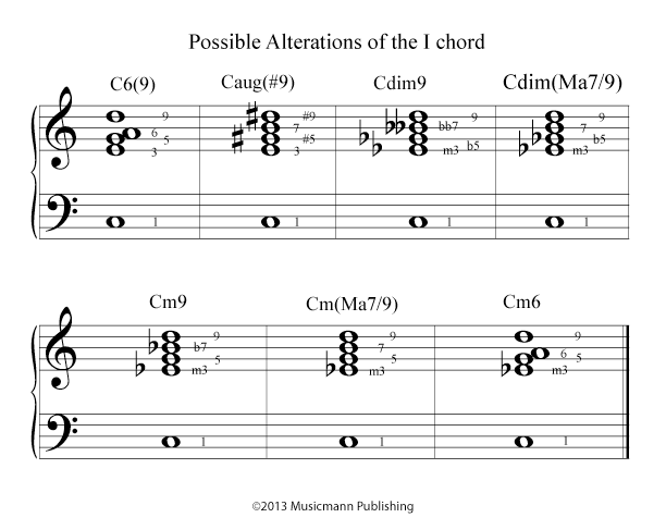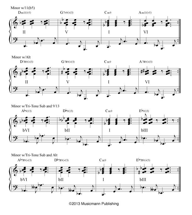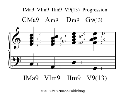 Once you have mastered the major and minor progressions, then you can start altering the 9th, 11th and 13 intervals.
