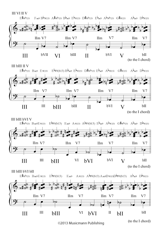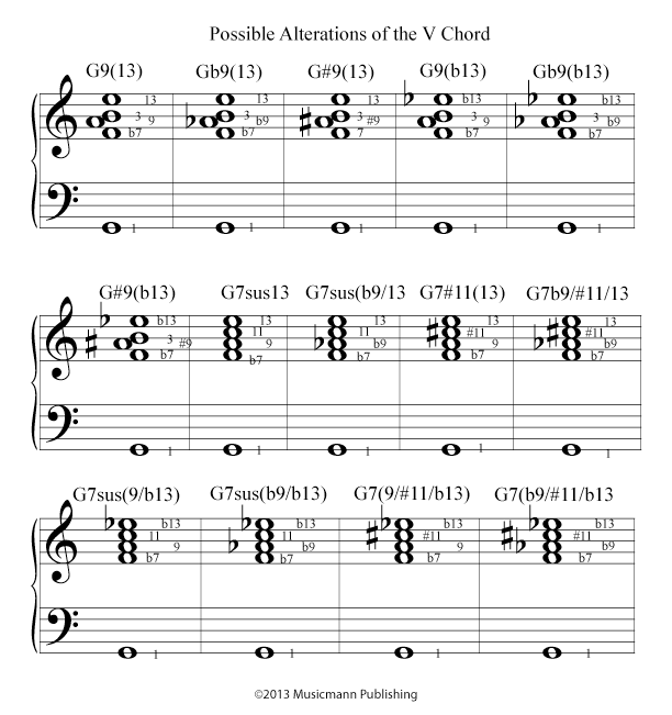 Here’s a suggestion for practice. Now that you know various progressions containing the V7 chord, start playing them around the Cycle of Fourths, Fifths and up and down chromatically. Take one V7 alteration at a time. Play it in all inversions.