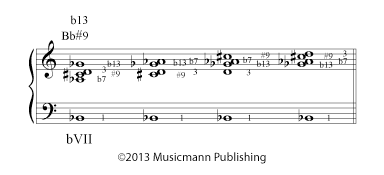 Since these are all dominant seventh chords, all the sevenths are flatted. Next, alter the 9th interval. You can play the ninth as a major 9, flatted 9th or sharped ninth. You can also alter the 13th as a major 13th or flat 13th. Finally, you can alter the 11th. The natural 11th is also know as the sus 4. The sharp 11th is also an augmented fifth.