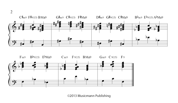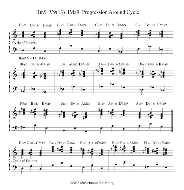 • I can quickly and easily play the full IIm9 V9(13) IMaj9 Progression around the Cycle of Fourths, Cycle of Fifths and up and down chromatically in all keys.
