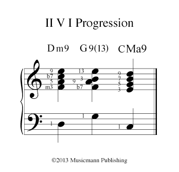 Now, after studying the II V Is in the Major and Minor thirds and sevenths, practice the full IIm9 V9(13) IMaj9 Progression.   Study the II V Is in major and minor diligently around the Cycle of Fourths and Fifths and up and down chromatically.[/features_box_yellow]