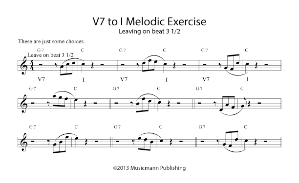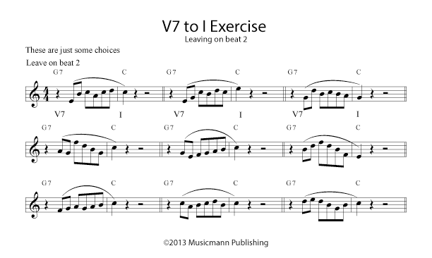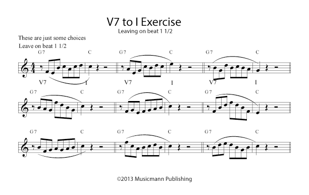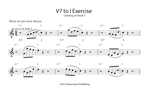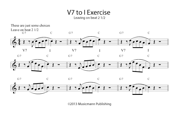 When you have exhausted all the possibilities (in every key) of leaving on the “and of 3”, then explore leaving on 3.  You will notice that now it takes 5 notes to resolve to the I chord (count 3+4+1).  Every time you leave from a different beat – you have to re-organize the notes to the resolution.