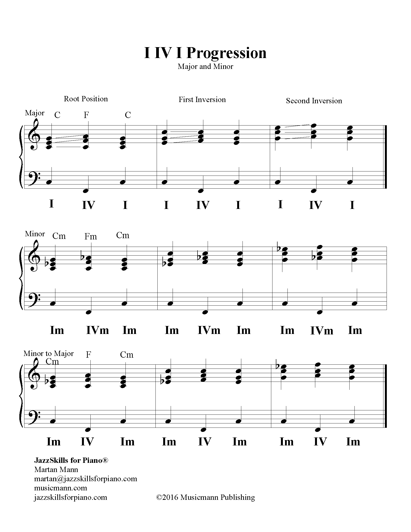 The Simple Major/Minor Progression uses mainly seventh chords: IIm7, V7, C6 (or major seventh), IVMa7. Then the bass line goes down a flatted fifth (tritone) to the IIm7(b5), Vb9, and Im (in the relative minor). It should be learned in all keys, around the cycle of fourths and fifths, and up-and-down chromatically. Learn it in all inversions. Learn with only the left hand playing the chords.