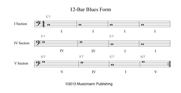 But, we must begin by mastering the Twelve-bar Blues. We think of the Twelve-bar Blues as three groups of four measures. In general they are described as follows: Section 1 is the I chord; Section 2 is the IV chord and Section 3 is the V chord. Study the examples below and the video.
