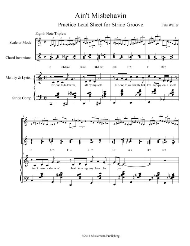 I can play the Stride Groove through the tune with the right hand playing the Continuous Melody Exercise using Quarter Notes, Eighth Notes, Quarter-note Triplets and Eighth-note Triplets.
