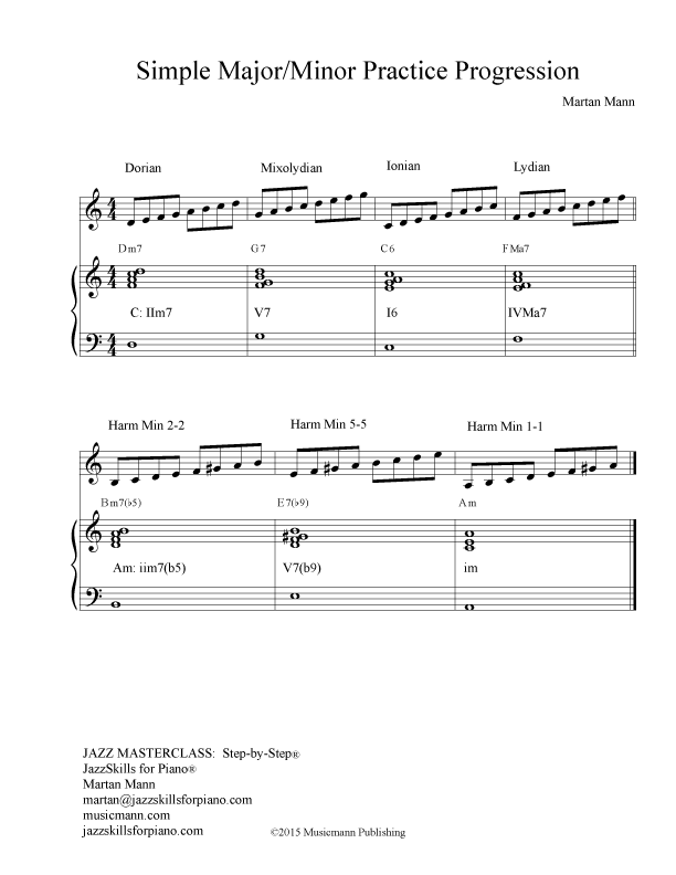 The Simple Major/Minor Progression uses mainly seventh chords: IIm7, V7, C6 (or major seventh), IVMa7. Then the bass line goes down a flatted fifth (tritone) to the IIm7(b5), Vb9, and Im (in the relative minor). It should be learned in all keys, around the cycle of fourths and fifths, and up-and-down chromatically. Learn it in all inversions. Learn with only the left hand playing the chords.