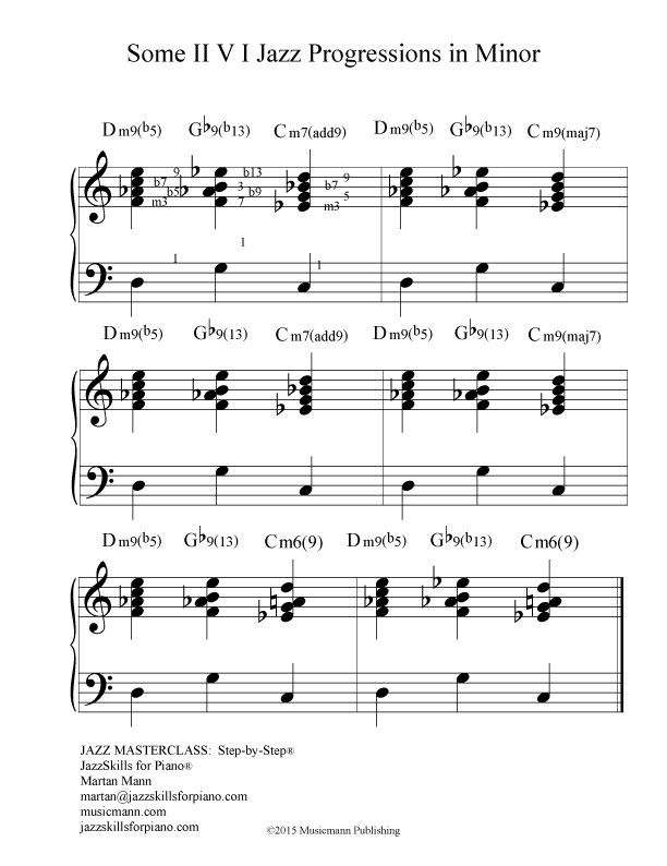 The Jazz Minor II V I Progression IIm9(b5), Vb9(b13), and Im9 (or I m9(Ma7). This is the standard minor jazz progression which is learned by all jazz pianists. It should be learned in all keys, around the cycle of fourths and fifths, and up-and-down chromatically. Learn it in all inversions. Learn with only the left hand playing the chords.
