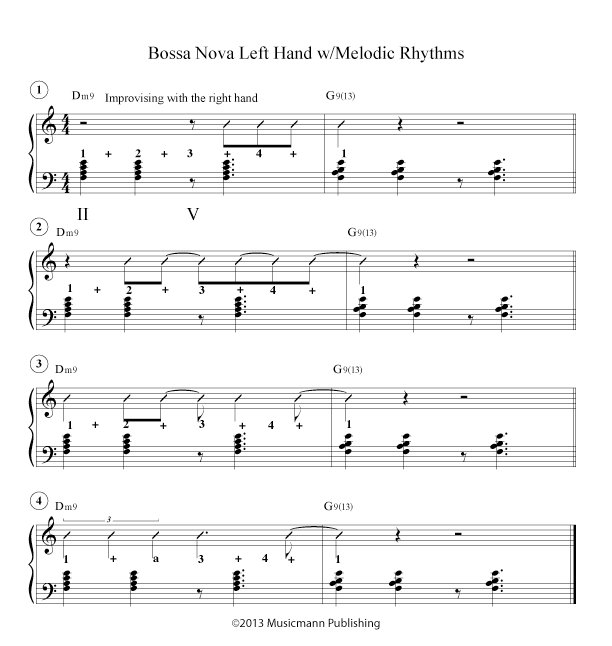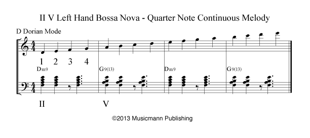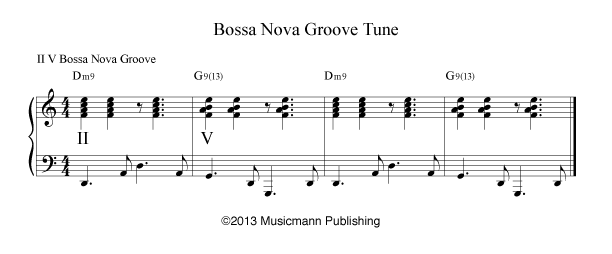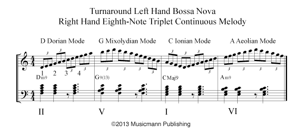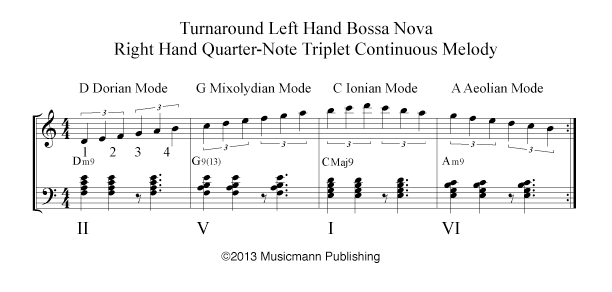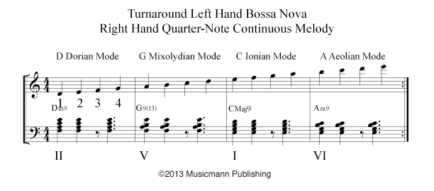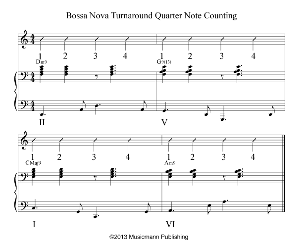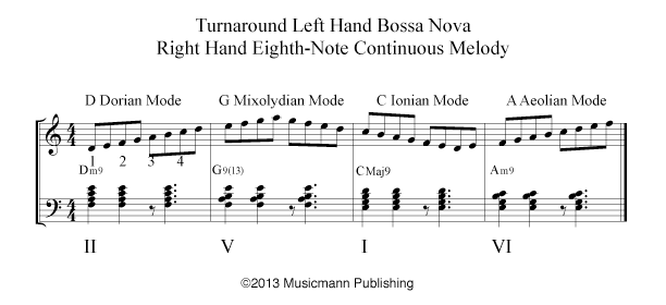 After you have studied the Bossa Nova w/Turnaround – Continuous Melody, start studying Bossa Nova w/Turnaround TriTone Substitution. [/features_box_yellow]