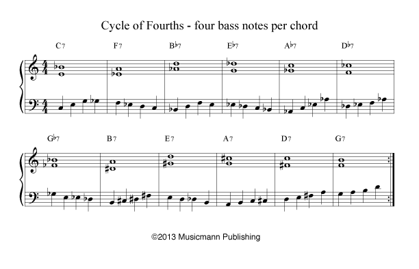 - Third, you need to develop an accompaniment pattern to play with a simple chord change. I often suggest using a diatonic turnaround, i.e.: I, VIm, IIm, V7. Play a looped pattern over and over as an accompaniment pattern. For instance: you can use a simple “chunk, chunk” in the left hand, playing quarter notes. Or, if you are more advanced, play a simple bass line. Play this chord pattern over and over while singing the groove. Perhaps, for example you can play a Boogie Woogie groove using a 12-bar blues. Make sure the accompaniment pattern you choose is easy for you to play.