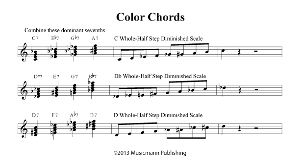 Develop Color Chords . . . which are four Dominant Seventh chords, played a minor third apart. For example: C7, Eb7, Gb7, A7. Or . . . Db7, E7, G7, Bb7. Or . . . D7, F7, Ab7, B7. (There are three different Color Chord combinations.) Mix and match the above chords.