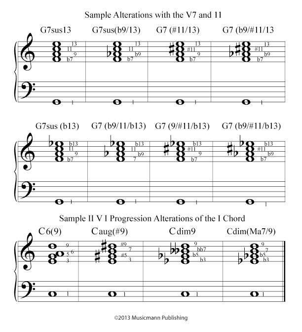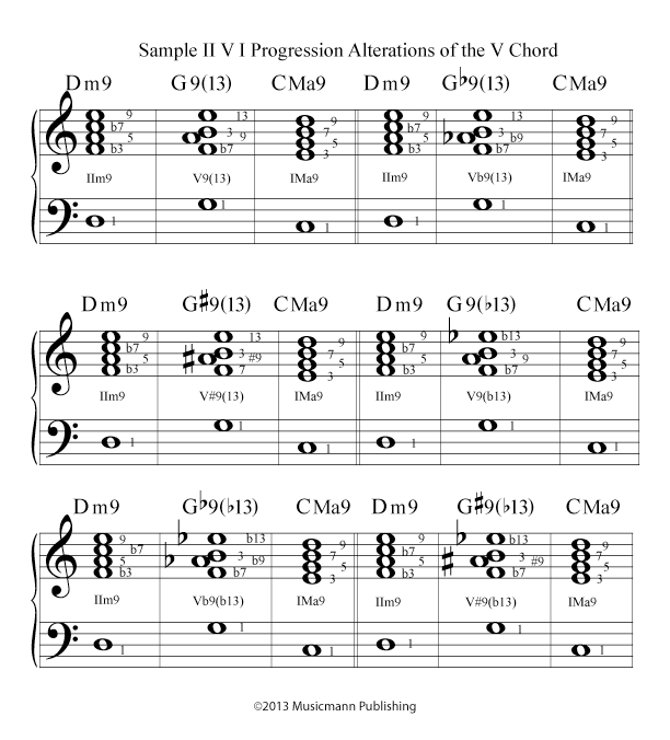 This is where the II V I Progression study gets a lot more complicated. We can alter the II chord, V chord and I chord. Most of the alterations take place in the V chord. So start your study there. Play all of the alterations until you know each completely. Use the II V I Progression as a vehicle for learning the alterations. Of course, play the alterations in ALL inversions. Play around the Cycle of Fourths, Cycle of Fifths and up and down Chromatically. This is definitely a long-term exercise. Keep at it!