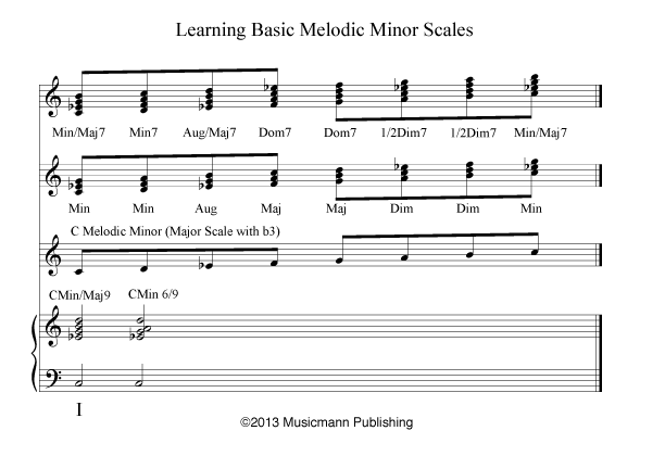 For instance, if you are playing a Minor/Major Seventh Chord, the appropriate scale or mode does not exist in the Major Scale. It does exist, though, in the Melodic Minor Scale (1-1).